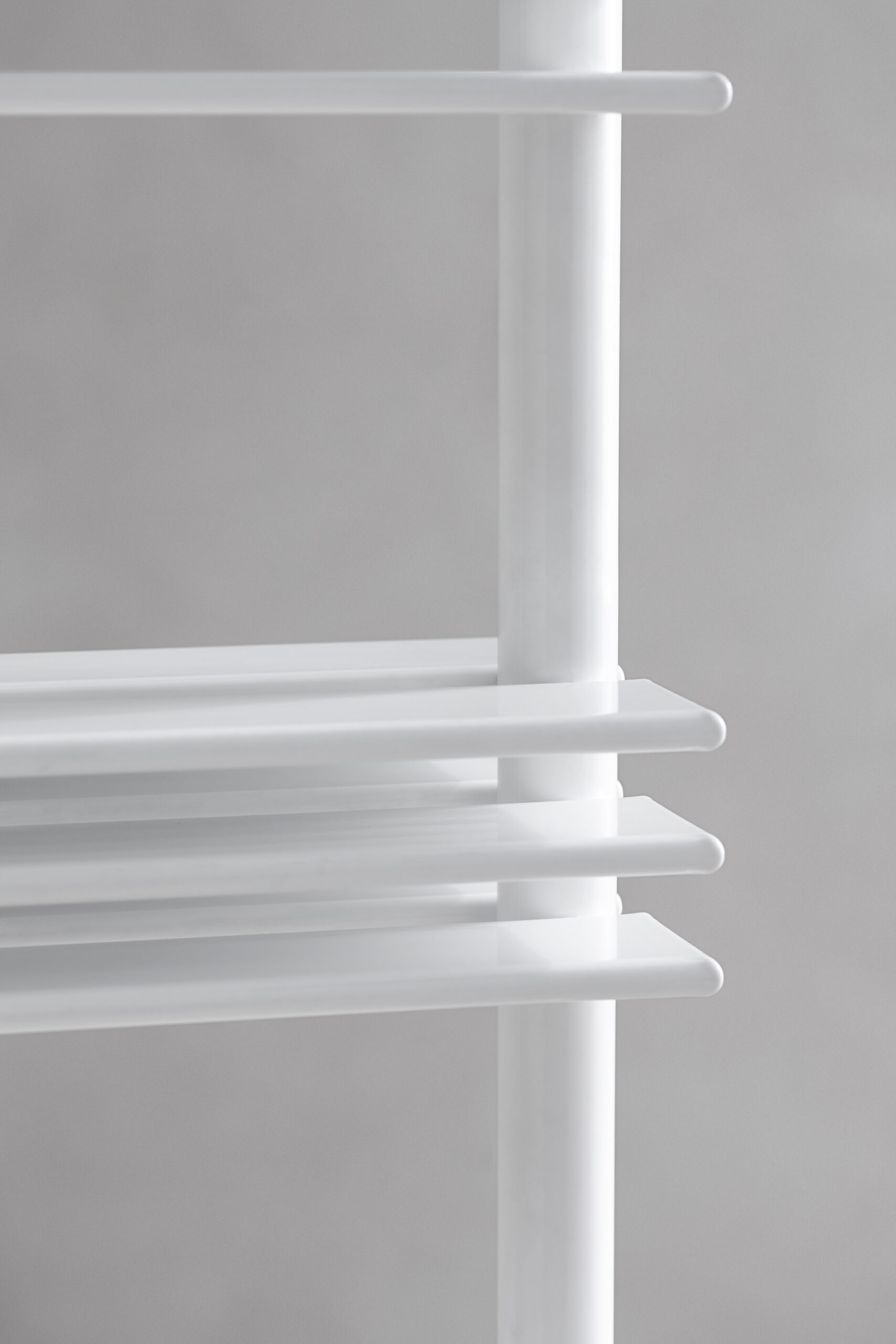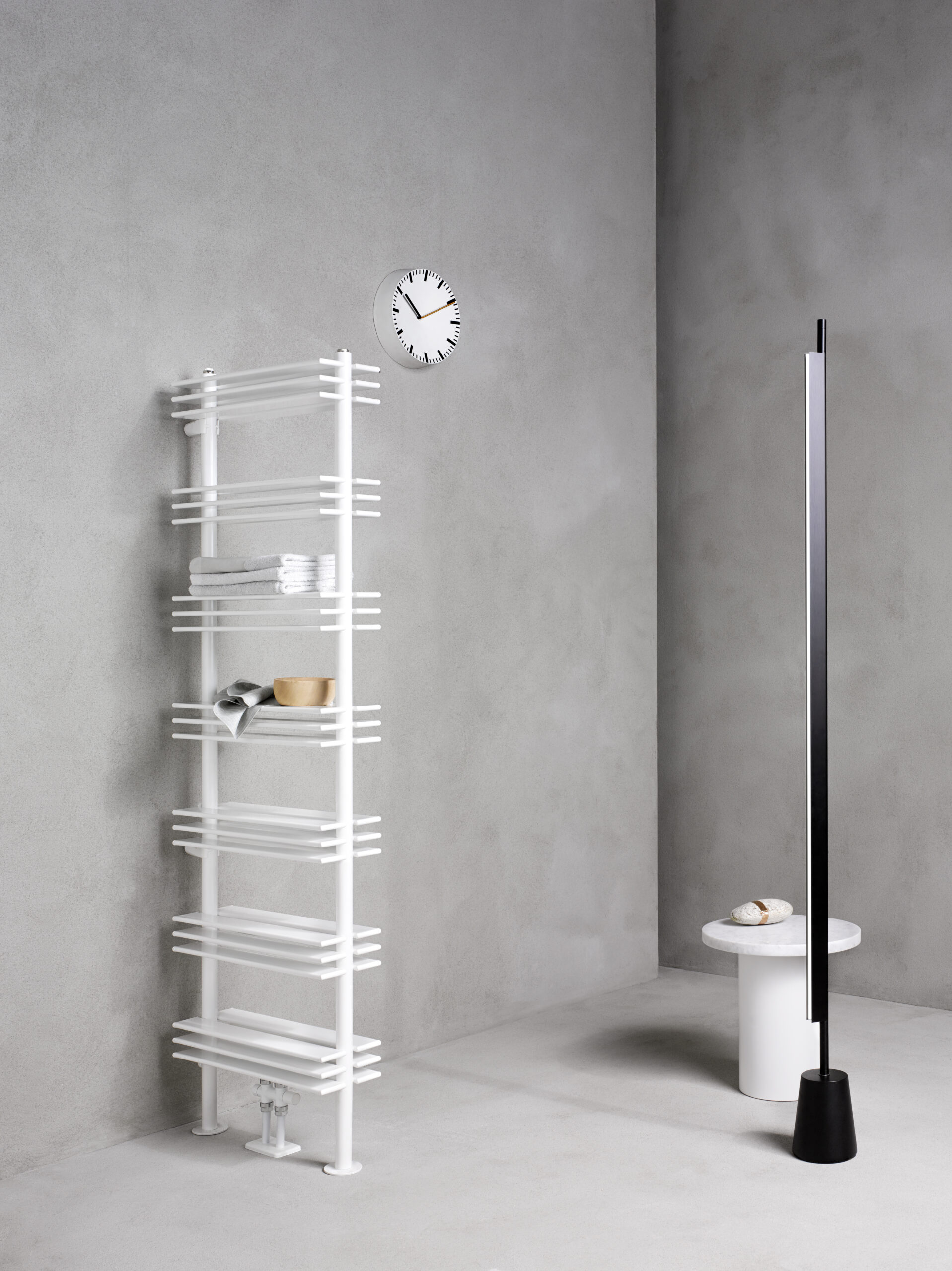 Un segno grafico netto e generoso che valorizza il bagno, trasformando la funzione del riscaldamento in un raffinato sistema espositivo e d’arredo